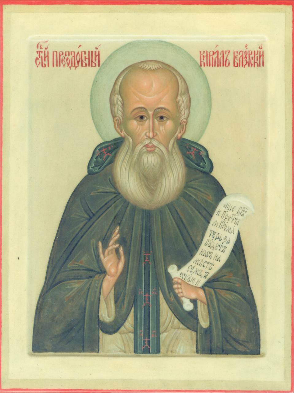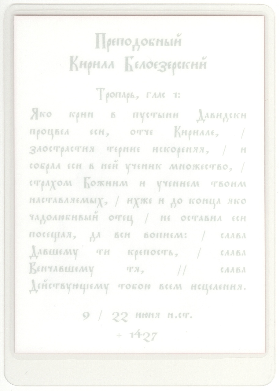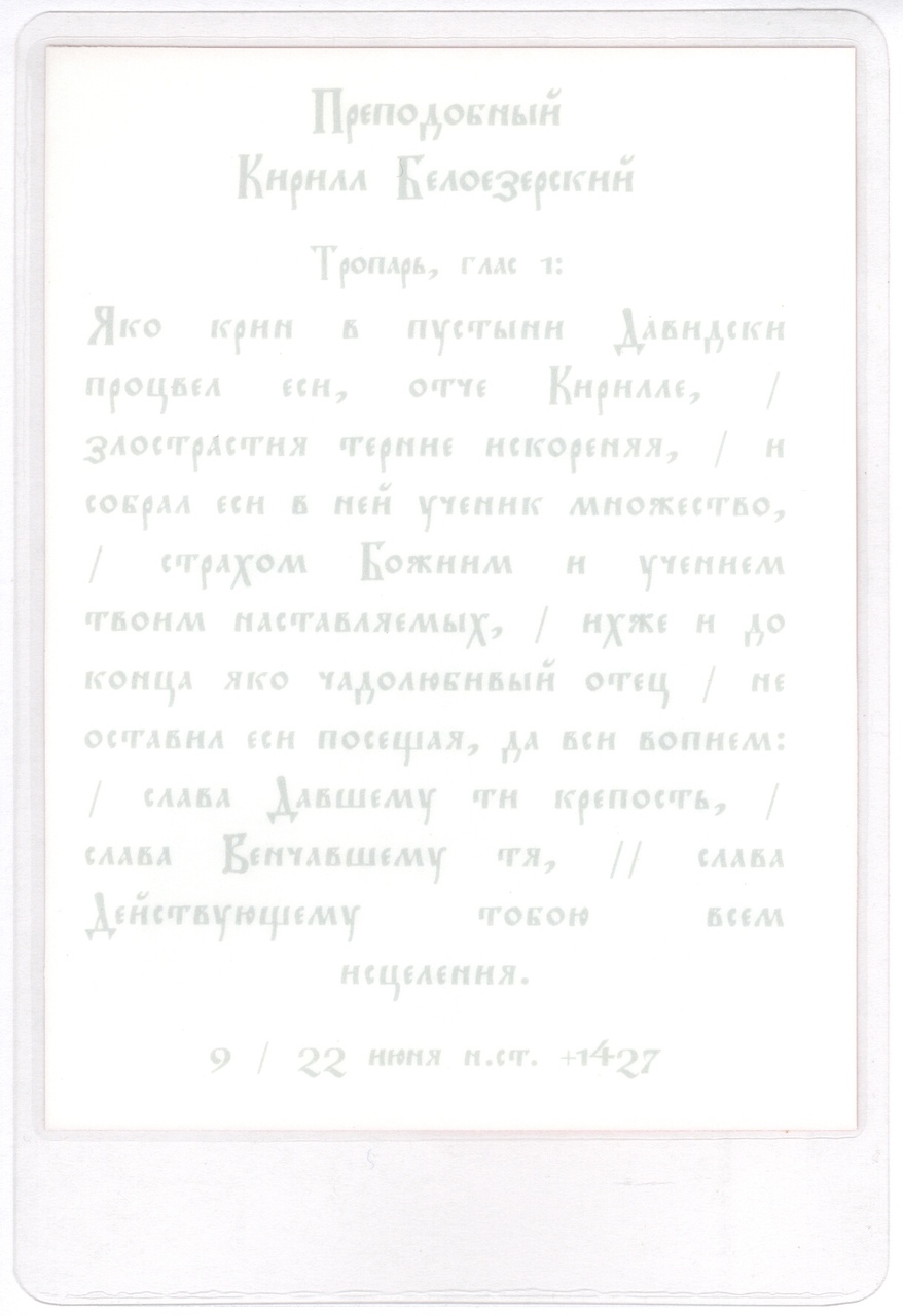 Аналойная икона прп. Кирилла написана иконописцем-реставратором высшей категории Соколовой Верой Фёдоровной в ферапонтовской иконописной мастерской в 2000-е годы.