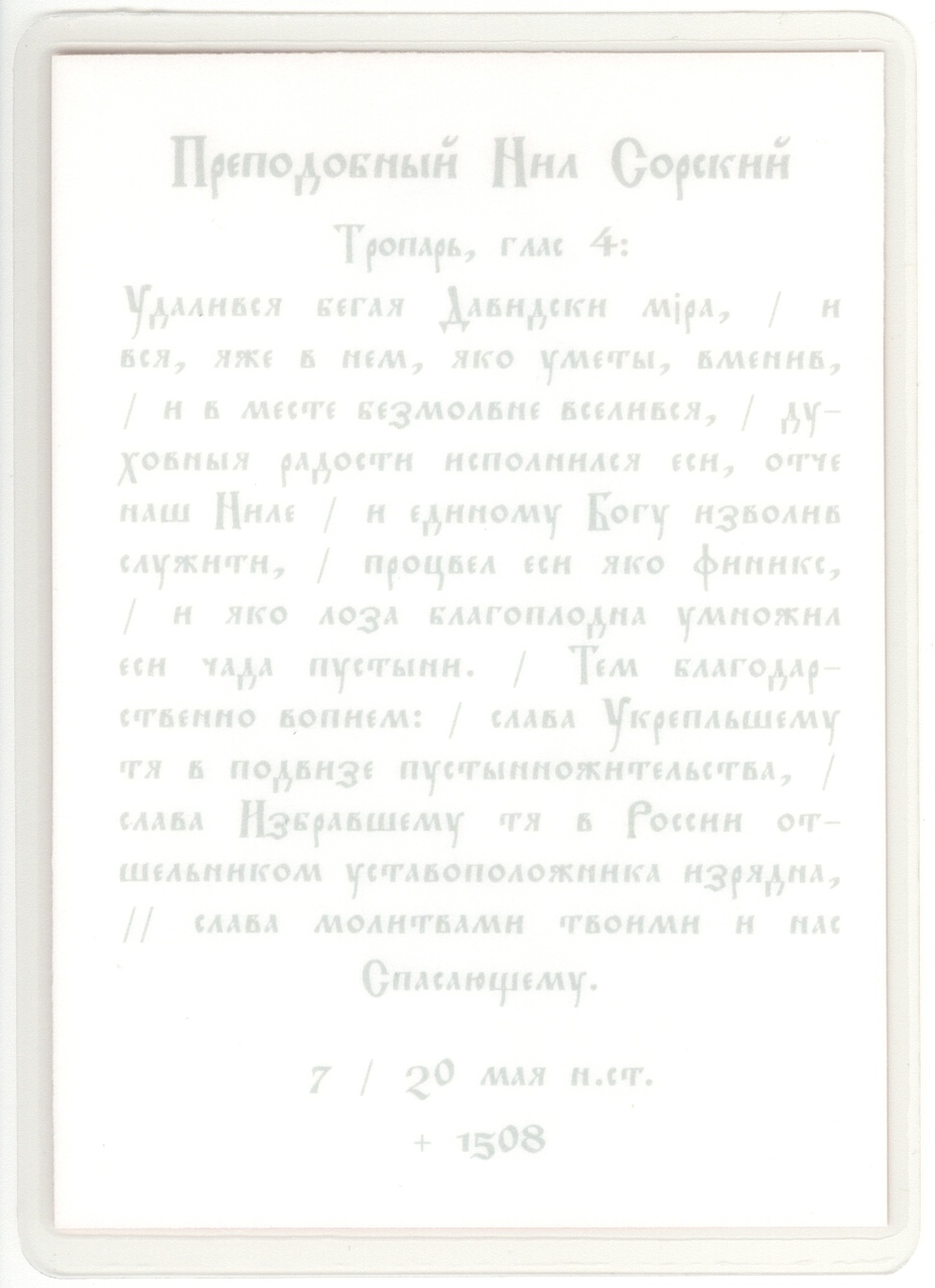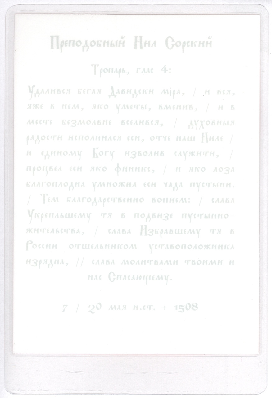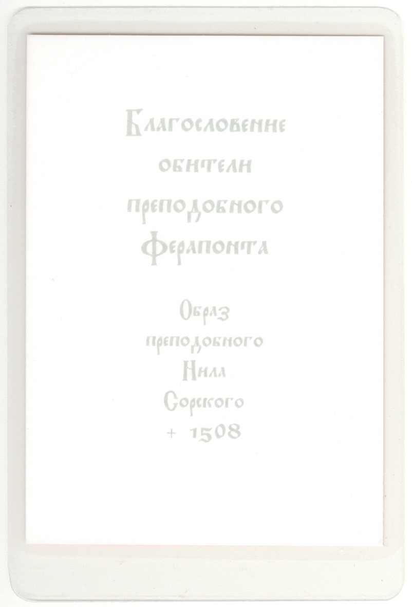 Храмовая икона прп. Нила написана в ферапонтовской иконописной мастерской настоятелем прихода в Ферапонтово протоиереем Сергием Ершовым к освящению деревянной церкви прп. Нила Сорского в Ферапонтове в 2008 году.