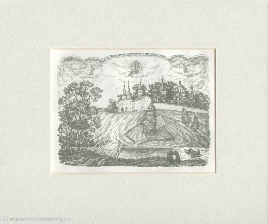 Эта работа выполнена в экспериментальной московской эстампной мастерской, в редкой теперь технике цветной литографии. Когда-то литография была очень популярна, особенно во второй половине XIX века. Теперь её знают только коллекционеры и историки искусства. Традиционно в технике литографии изображались памятные места, портреты царей и полководцев, знаменитые монастыри. Эта литография отсылает нас во времена ушедшей эпохи, она исполнена в старинном и немного наивном стиле. Ферапонтов монастырь изображён стоящим в окружении больших деревьев, как было когда-то, и над речкой Паской стоит ещё деревянный мост...