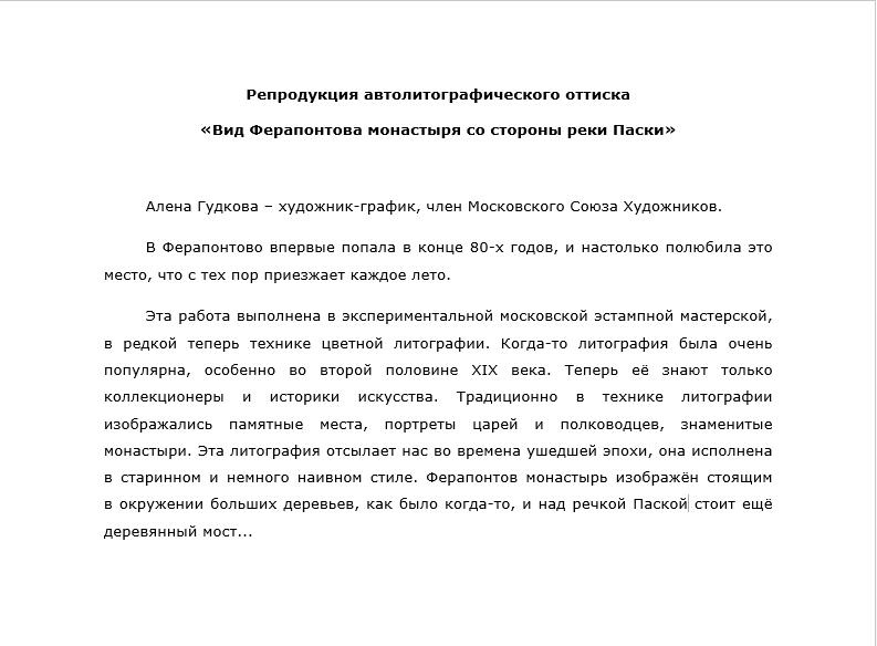 Эта работа выполнена в экспериментальной московской эстампной мастерской, в редкой теперь технике цветной литографии. Когда-то литография была очень популярна, особенно во второй половине XIX века. Теперь её знают только коллекционеры и историки искусства. Традиционно в технике литографии изображались памятные места, портреты царей и полководцев, знаменитые монастыри. Эта литография отсылает нас во времена ушедшей эпохи, она исполнена в старинном и немного наивном стиле. Ферапонтов монастырь изображён стоящим в окружении больших деревьев, как было когда-то, и над речкой Паской стоит ещё деревянный мост...