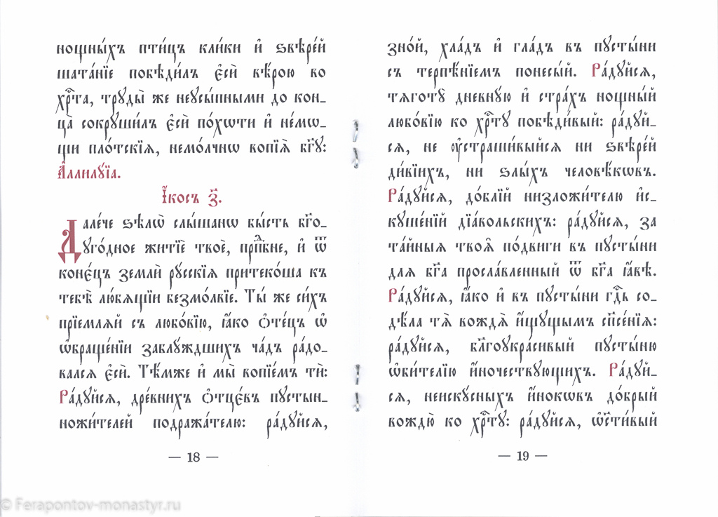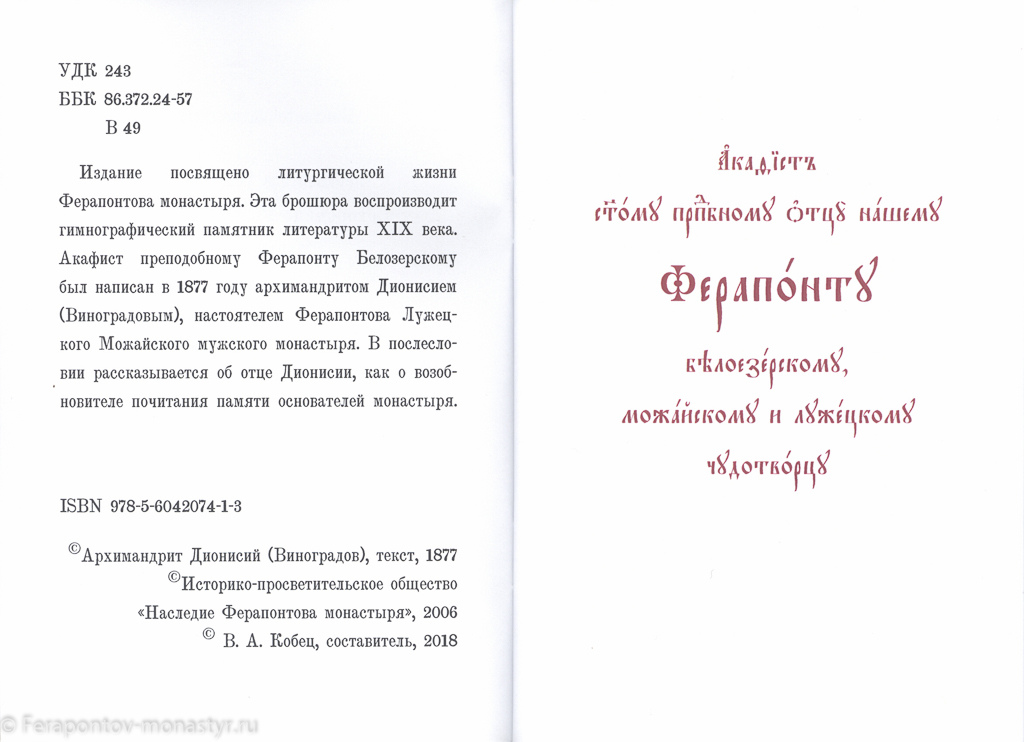 Издание посвящено литургической жизни Ферапонтова монастыря. Эта брошюра воспроизводит гимнографический памятник литературы XIX века. Акафист преподобному Ферапонту Белозерскому был написан в 1877 году архимандритом Дионисием (Виноградовым), настоятелем Ферапонтова Лужецкого Можайского мужского монастыря. В послесловии рассказывается об отце Дионисии, как о возобновителе почитания памяти основателей монастыря.
