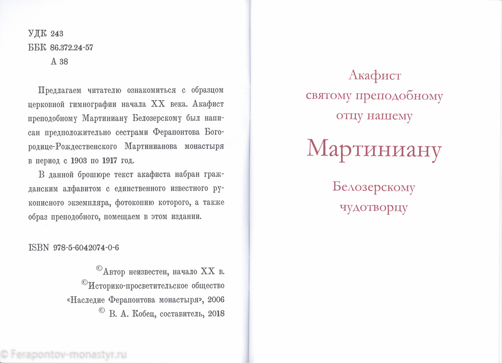 Книга: «Акафист святому преподобному отцу нашему Мартиниану Белозерскому чудотворцу».