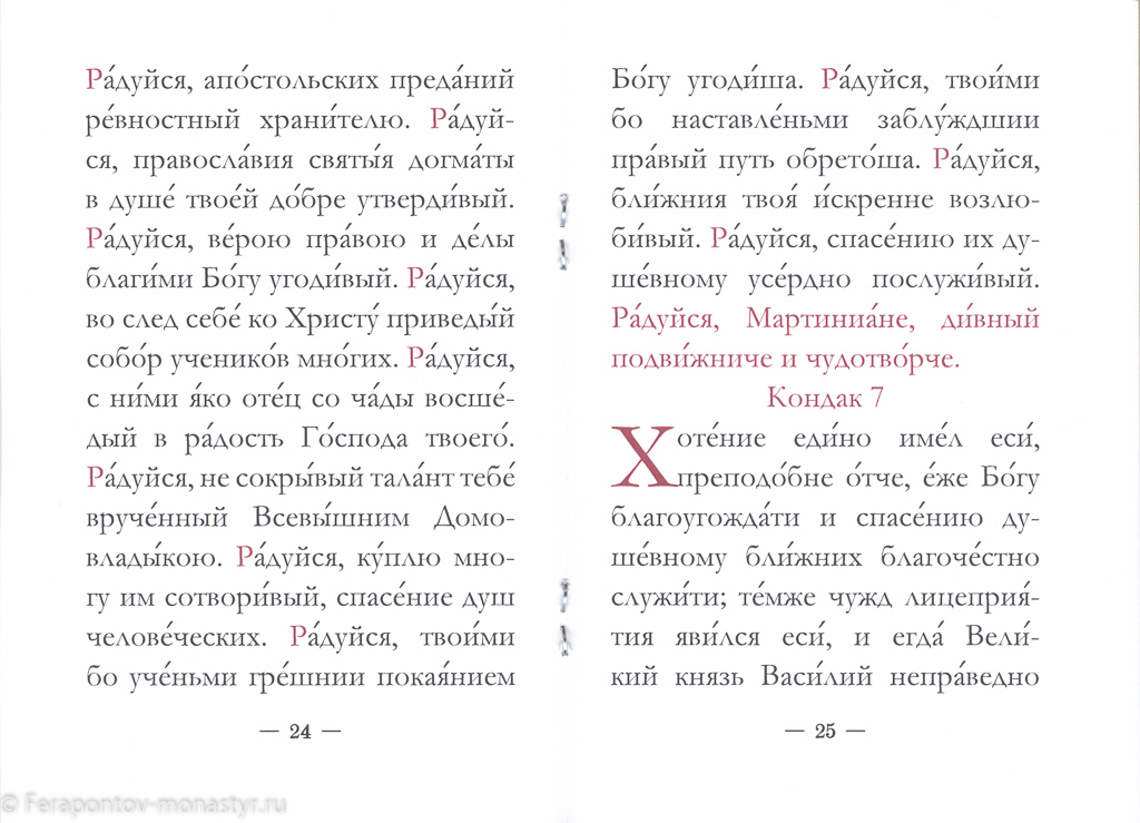 Предлагаем читателю ознакомиться с образцом церковной гимнографии начала XX века. Акафист преподобному Мартиниану Белозерскому был написан предположительно сестрами Ферапонтова Богородице-Рождественского Мартинианова монастыря в период с 1903 по 1917 год.